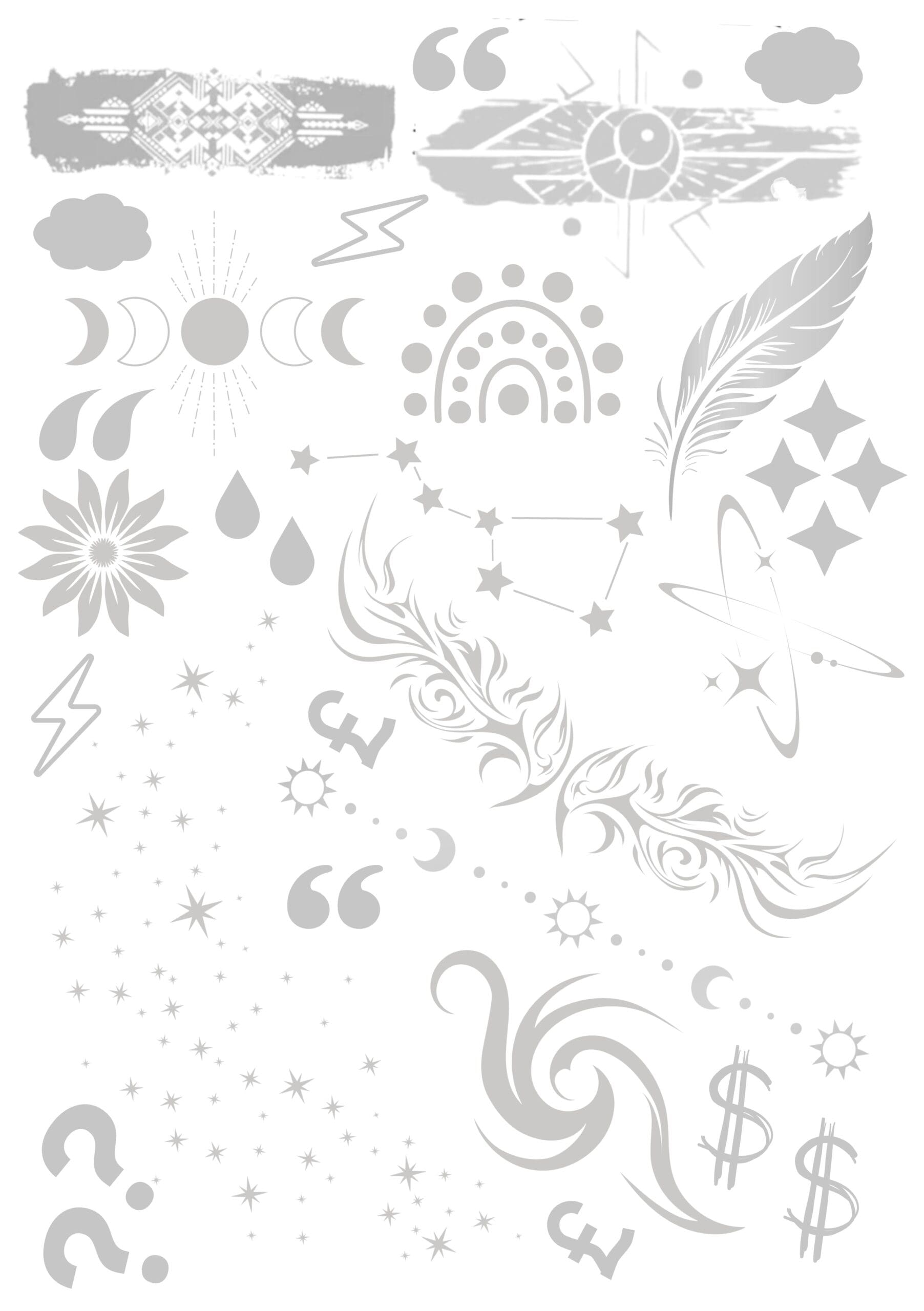 Dazzle and shine with this opulent Silver Foil Designs A5 Sheet No 2 temporary tattoo. The perfect Metallic style for a luxurious festive look.